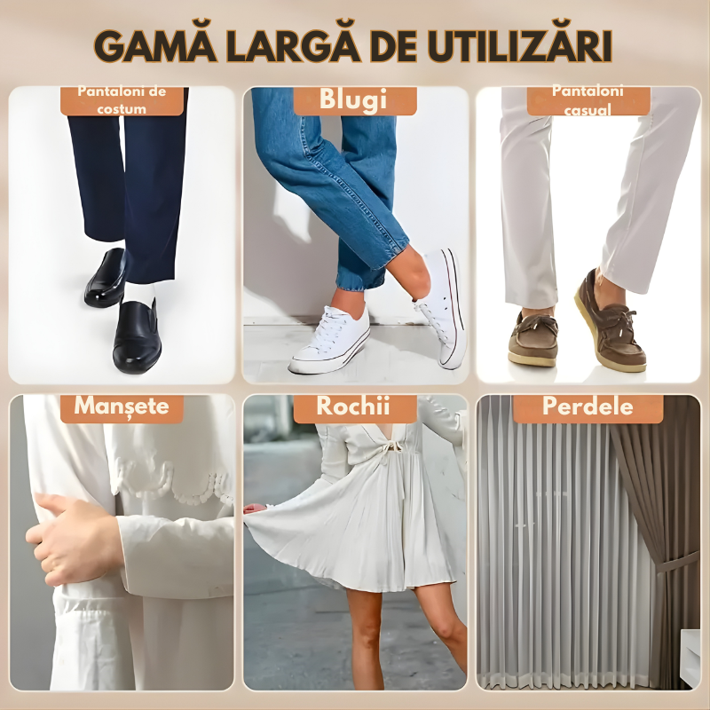 Perfectă pentru pantaloni, rochii, manșete de cămașă, perdele, fețe de masă, lenjerii de pat și multe altele — totul fără cusături! ✂️