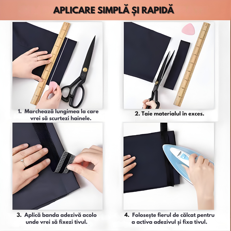 💨 Fixează cu fierul de călcat pentru a activa adezivul și a fixa permanent tivul.